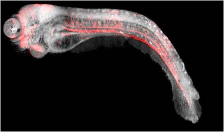Die Blutgefäße werden in Rot visualisiert und mit der Morphologie in Grau überlagert. Beim kranken Fisch erkennt man, dass der Körper deutlich vergrößert und verformt sowie der Kopf deformiert ist. Weiters ist auch zu sehen, dass die Blutgefäße keine einheitliche Struktur aufweisen. Der Blutfluss ist somit verlangsamt und teilweise unterbunden. Daher können die Muskeln nicht mehr mit Nährstoffen versorgt werden. Da der Tumor sich vom Rückenmark aus entwickelt, verändert sich auch deutlich das Verhältnis zwischen Rückenmark- und Notochorddurchmesser. Die Wirkung der Medikamente ist deutlich an der Reduzierung der Deformationen und dem verstärkten Blutfluss zu erkennen.