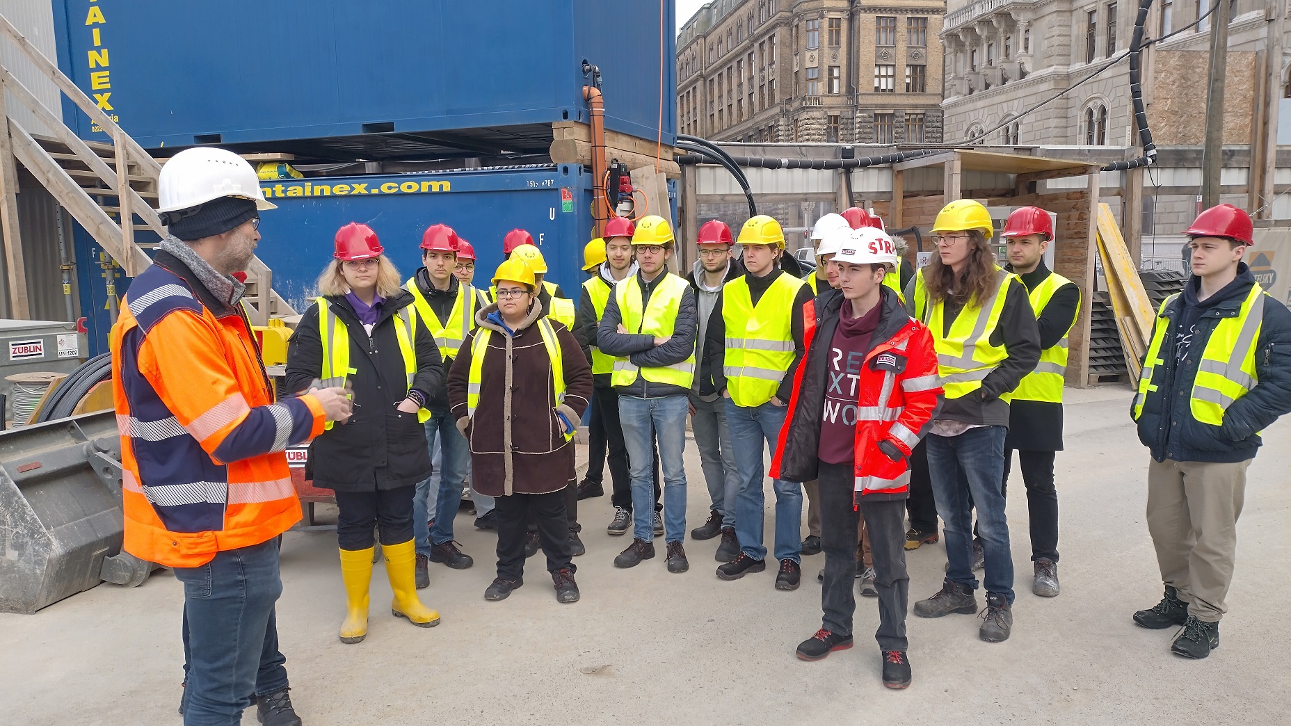 Mit Sicherheitsschuhen, Sicherheitshelm und Warnweste ausgestattet, begann unsere Führung der U5/U2 Baustelle. Wir erhielten einen kurzen Überblick über die bisher durchgeführten Grabungsarbeiten und das weitere Bauvorhaben. Beeindruckend waren die Vorbereitungsarbeiten, wie etwa die Verstärkung von Fundamenten von alten Gebäuden, oder das Abpumpen des Grundwassers, um die Grabungsarbeiten überhaupt starten zu können. Die Möglichkeit, einzelne Gebäude über den Verlauf der Tunnelröhre zentimetergenau heben zu können, beeindruckte uns sehr.