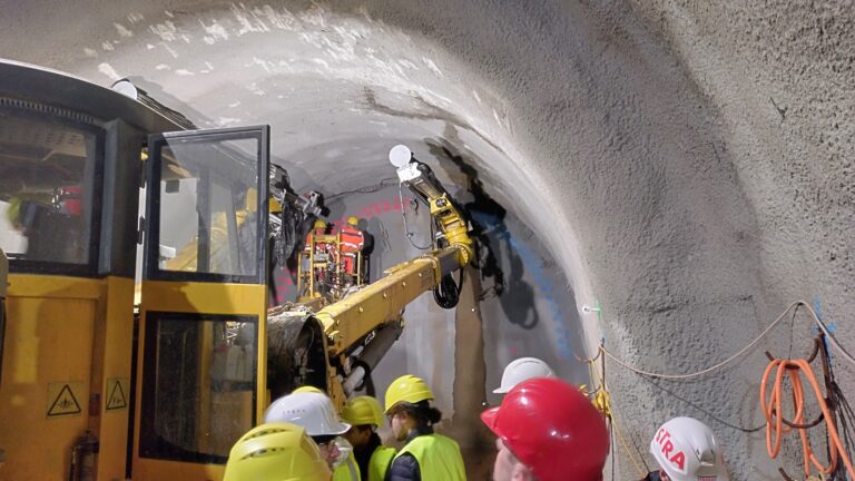 Eine Wendeltreppe führte uns anschließend 30m unter die Oberfläche, wo uns dann die beiden Tunnelröhren gezeigt wurden. In einer war die Ortsbrust mit den, mit Spritzbeton fixierten, Stahlgittermatten zu sehen. Wir sahen dabei den Bagger bei den finalen Abgrabungsarbeiten für diesen Arbeitsschritt und das Aufbringen des Spritzbetons.