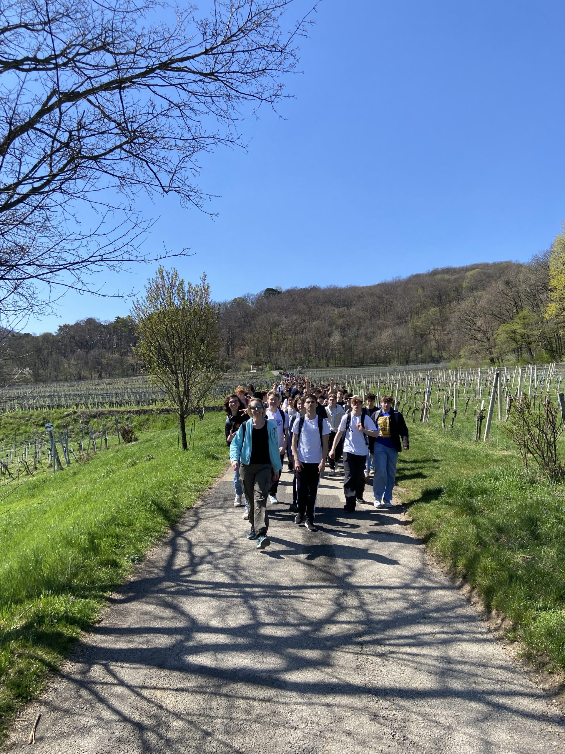 Rund 200 Schüler*innen der HWI machten sich am 4. April 2025 auf zum Wandertag – Ziel: die Perchtoldsdorfer Heide und der legendäre Salzstangerlwirt auf der Kugelwiese. Nachdem sämtliche Salzstangerl ausverkauft waren und genügend Sonne getankt wurde, stand der Abstieg am Plan. Auf dem Rückweg sorgte die wandernde Schülerkolonne für einen 15-minütigen Stillstand im Kreisverkehr beim Perchtoldsdorfer Marktplatz. Fazit: Viel frische Luft, volle Mägen – und ein Wandertag, der in die HWI-Geschichte eingeht.