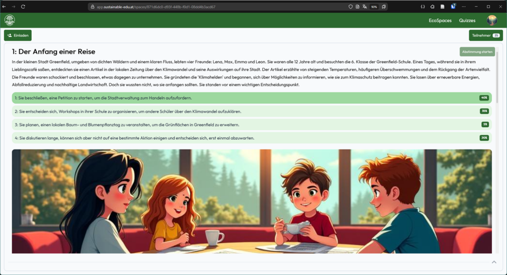 Im Rahmen des Diplomprojekts sustAInableEducation, welches Nachhaltigkeitsthemen und künstliche Intelligenz im Bildungsbereich vereint, hat die Diplomarbeitsgruppe ein innovatives Lernkonzept entwickelt. Die interaktive Web-Applikation soll Schüler*innen nicht nur für umweltbewusste Themen sensibilisieren, sondern auch den spannenden Einsatz von KI im Rahmen von kollaborativ erlebbaren KI-generierten Geschichten zu Nachhaltigkeitsthemen im Klassenverband erlebbar machen. Die Gruppe darf sogar als eine von 5 Gruppen ins Finale des Bundeswettbewerb „Jugend Innovativ“ in der Kategorie Nachhaltigkeit einziehen.
