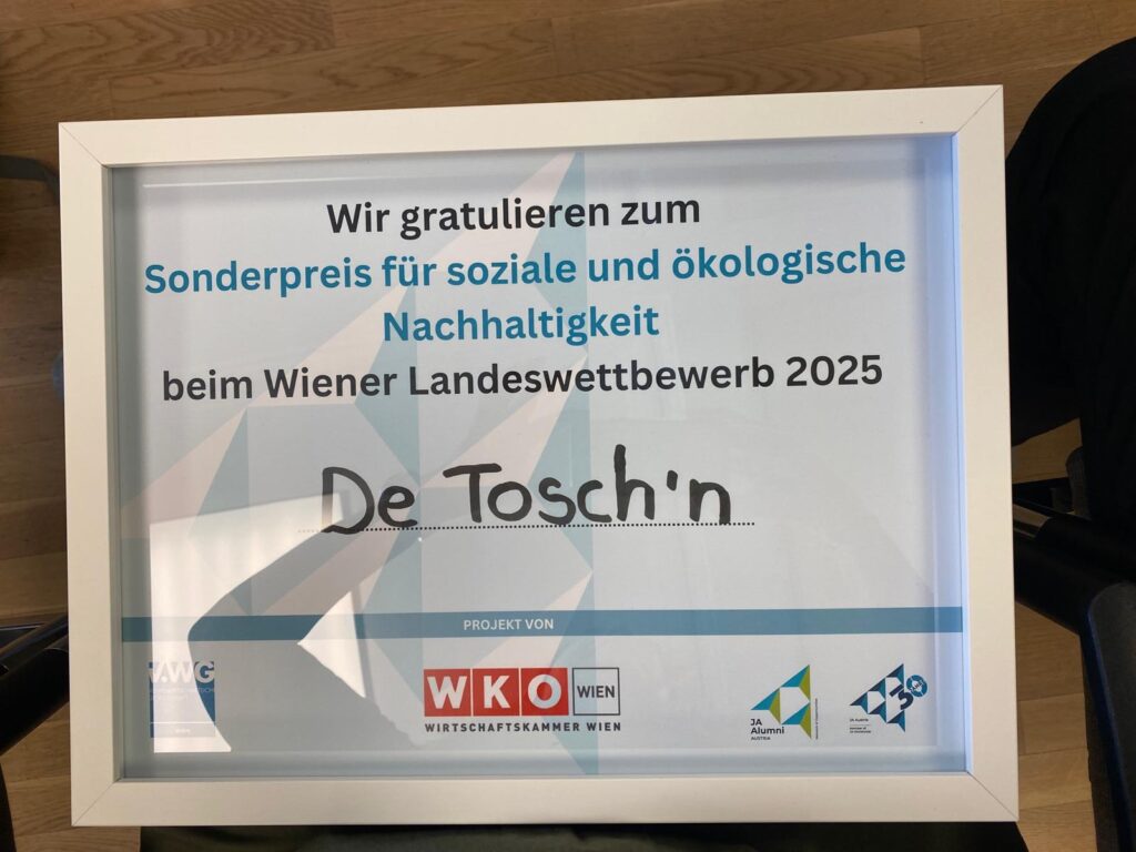 Am 30.4.2025 wurde die Junior Company De Toschn beim Wiener Landeswettbewerb mit dem Sonderpreis für soziale und ökologische Nachhaltigkeit ausgezeichnet.