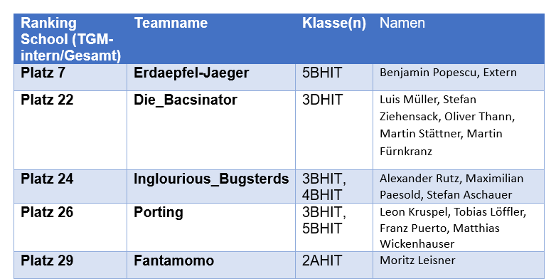 Das Team „Erdaepfel-Jaeger“ mit Benjamin Popescu (5BHIT) und einem externen Schüler erreichte mit Platz 7 die beste Platzierung in der #School-Kategorie. Nur knapp dahinter folgten die Teams „Die_Bacsinator“ (Platz 22), „Inglourious_Bugsterds“ (Platz 24), „Porting“ (Platz 26) und „Fantamomo“ (Platz 29), die alle unter den Top 30 landeten und damit das hohe Niveau der TGM-Ausbildung eindrucksvoll unter Beweis stellten.