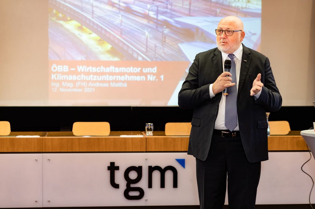 CEO Andreas Matthä zeigte zu Beginn in einer kurzen Präsentation den jungen Techniker*innen die wesentlichen ÖBB Entwicklungen und Zukunftspläne im Personenverkehr, Infrastruktur und Schienengüterverkehr auf, „Bereits jetzt fahren in keinem anderen Land der EU mehr Menschen pro Jahr mit der Bahn, wie in Österreich. Auch beim Güterverkehr sind wir als Nummer 2 in Europa ganz vorne mit dabei.“ betonte Matthä. Im Vor-Coronajahr 2019 nutzen 477 Millionen Reisende die Angebote der ÖBB mit Bahn und Bus bzw. beförderte die ÖBB Rail Cargo Group über 100 Mio. Tonnen/Jahr. Ein wichtiger Punkt in der Diskussion war auch der Klimawandel und die Rolle der Bahn – „Die Bahn ist die Antwort auf die Klimakrise“. Die ÖBB sparen jährlich rund 4,2 Mo. Tonnen CO2 ein. Zur Erreichung der Klimaziele der EU bis 2050 bzw. Österreichs bis 2040 müssen vor allem mehr Güter mit der Bahn transportiert werden. „Wir brauchen eine Verkehrswende. Weniger Straßen- dafür mehr Schienengütertransporte! Schließlich ist die Bahn gegenüber dem Lkw wesentlich nachhaltiger.“ unterstrich Matthä. Damit die Verkehrswende gelingt, investieren die ÖBB in die Infrastruktur so viel wie noch nie und werden bis 2040 die Leistungsfähigkeit auf der Schiene in Österreich verdoppeln. Allein das in der Geschichte Österreich größte Investitionsprogramm von 18,2 Mrd. Euro von 2022 bis 2027 unterstreicht die rot-weiß-roten-Ambitionen; kein Land in der EU investiert derzeit mehr pro Kopf in die Bahn!