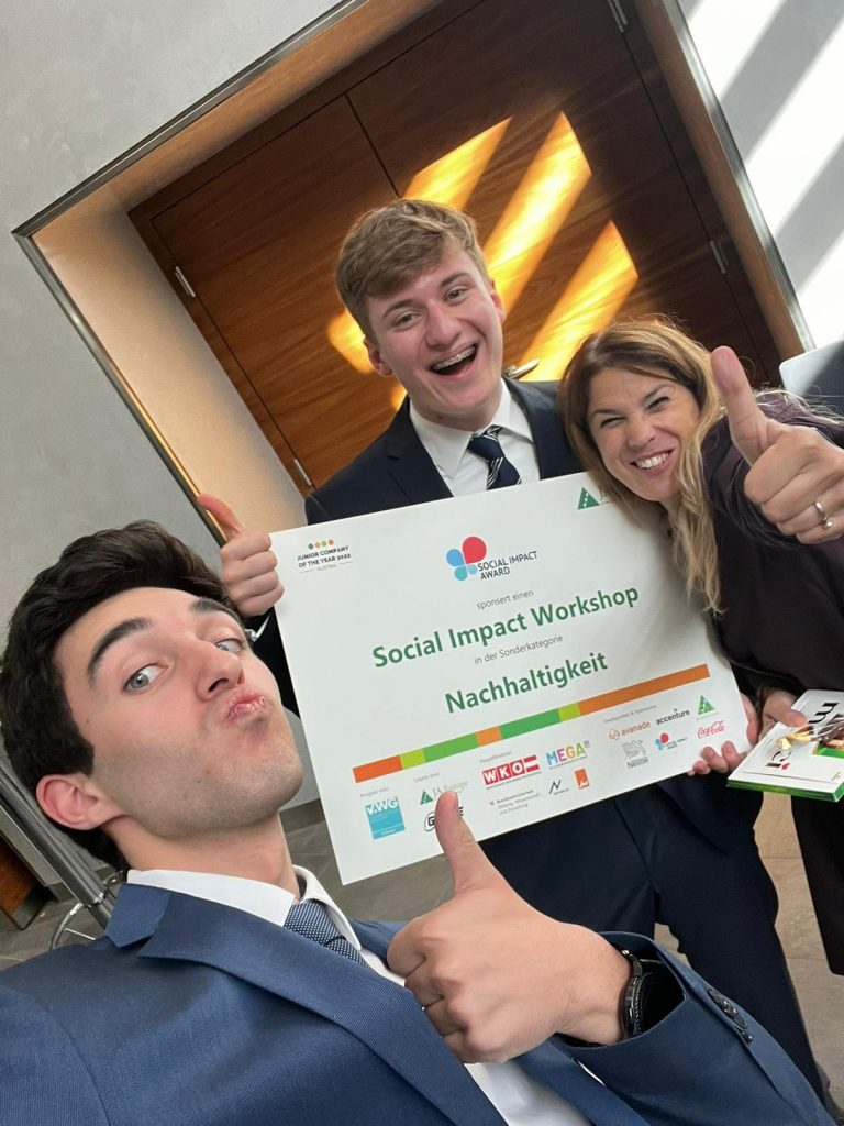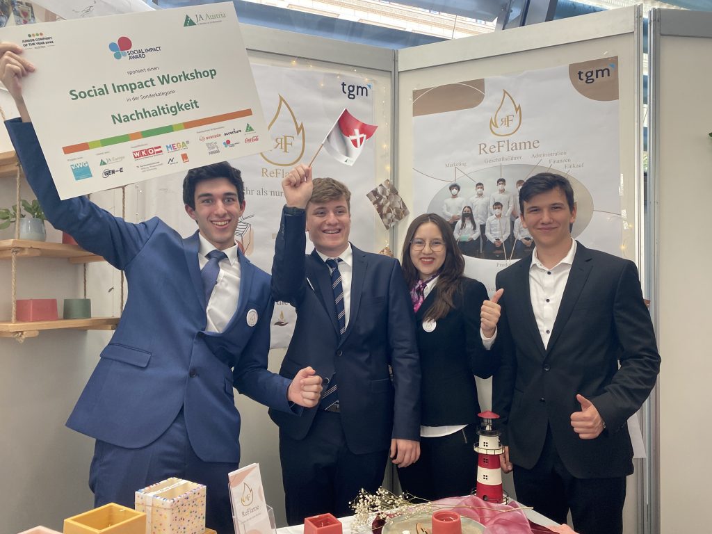 Ein erfolgreiches Juniorjahr geht zu Ende. Beyond gewinnt den Businessplanwettbewerb, alle vier Junior Companies unserer Abteilung sind im Finale des Wiener Landeswettbewerbs, bei dem ReFlame als beste Junior Company Wiens ausgezeichnet wird. Und nun gewinnt ReFlame im Bundesfinale der besten Junior Companies Österreichs den Social Impact Award als nachhaltigste Junior Company – wir gratulieren!